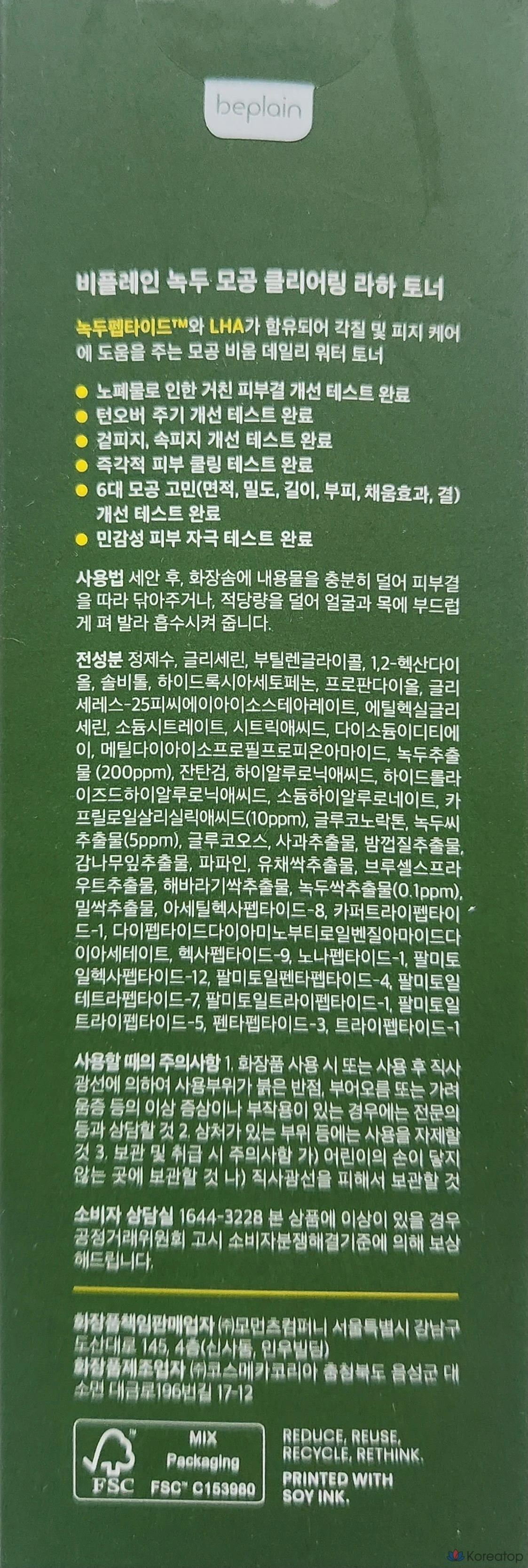 Тоник для очищения пор Beplain Green Bean