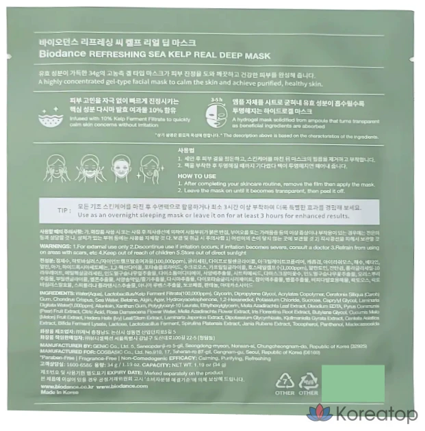 Маска с биоплотной текстурой обеспечивает плотное прилегание и эффективную доставку активных компонентов. Формула с морскими водорослями интенсивно успокаивает и восстанавливает кожу. Идеальна для моментального ухода и глубокого питания. 🌿