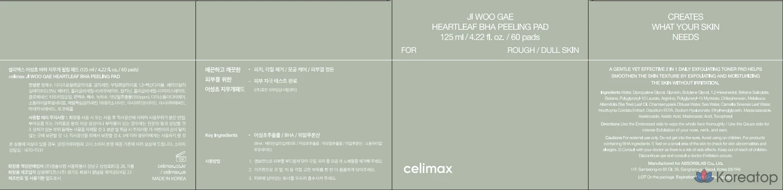 Отшелушивающие подушечки Cellimax BHA Eraser, 125 мл, 60 листов, 1 шт.