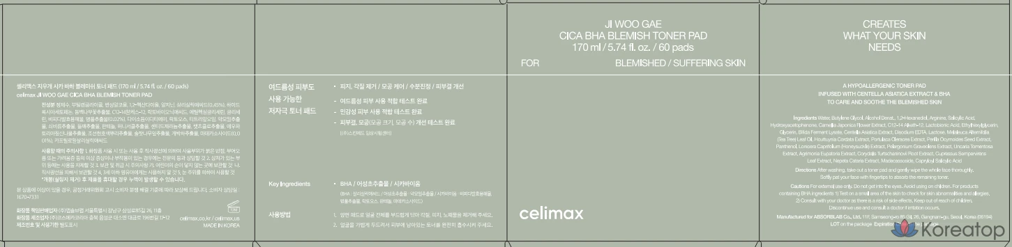 Тонизирующие подушечки для лица Cellimax Eraser Cica Baja от прыщей, 170 мл, 60 листов, 1 упаковка.