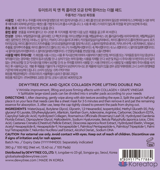Dewytree Pick & Quick Collagen Pore Elasticity Peeling Double Pad, 380g, 1 шт., 100 шт.