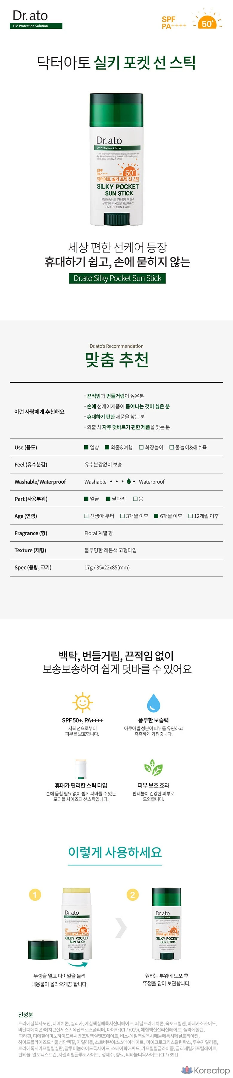 Солнцезащитный стик Dr. Ato Silky Pocket Sun Stick обеспечивает надежную защиту от ультрафиолетовых лучей благодаря SPF50+ и PA++++. Его компактный формат позволяет легко носить с собой и использовать в любое время. Стик содержит натуральные ингредиенты, которые увлажняют и питают кожу, не оставляя жирного блеска. Легкая текстура обеспечивает комфортное нанесение, делая его идеальным выбором для ежедневного использования. ☀️