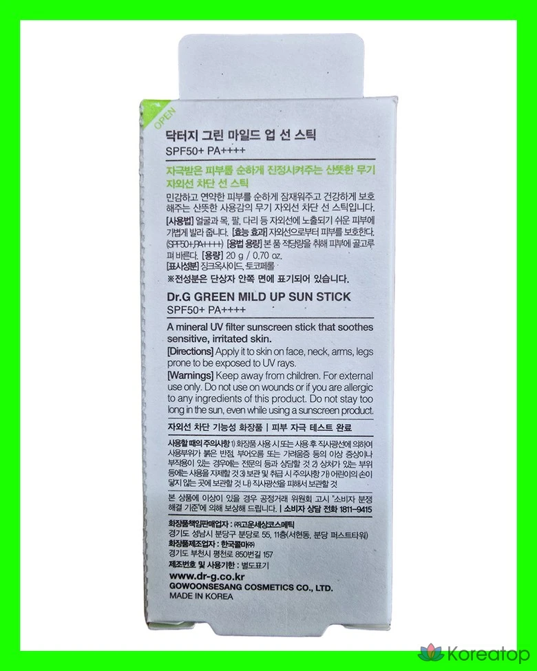 Солнцезащитный стик Dr.G Green Mild Up SPF50+ PA++++, 20 г, 1 шт.