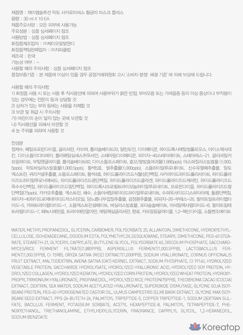 Маска для лица JM Solution Lactosaccharomyces Golden Rice Mask Plus, 10 шт., 1 упаковка