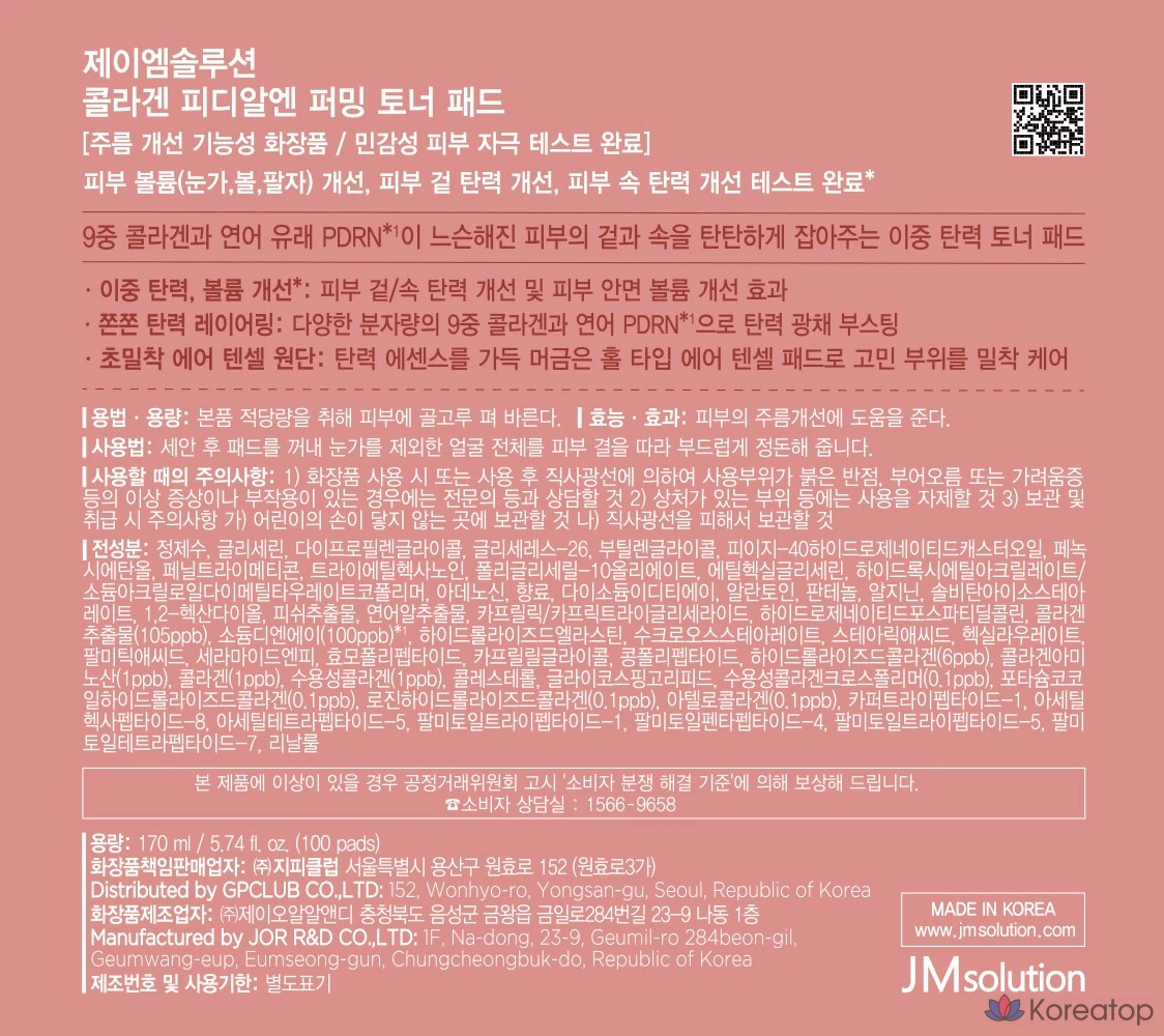 Тонизирующие подушечки JM Solution Collagen PDRN для укрепления кожи, 170 мл, 1 упаковка, 100 листов.