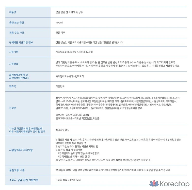 Шампунь для ног Kundal Clean & Fresh с травяной мятой, 1 шт., 400 мл