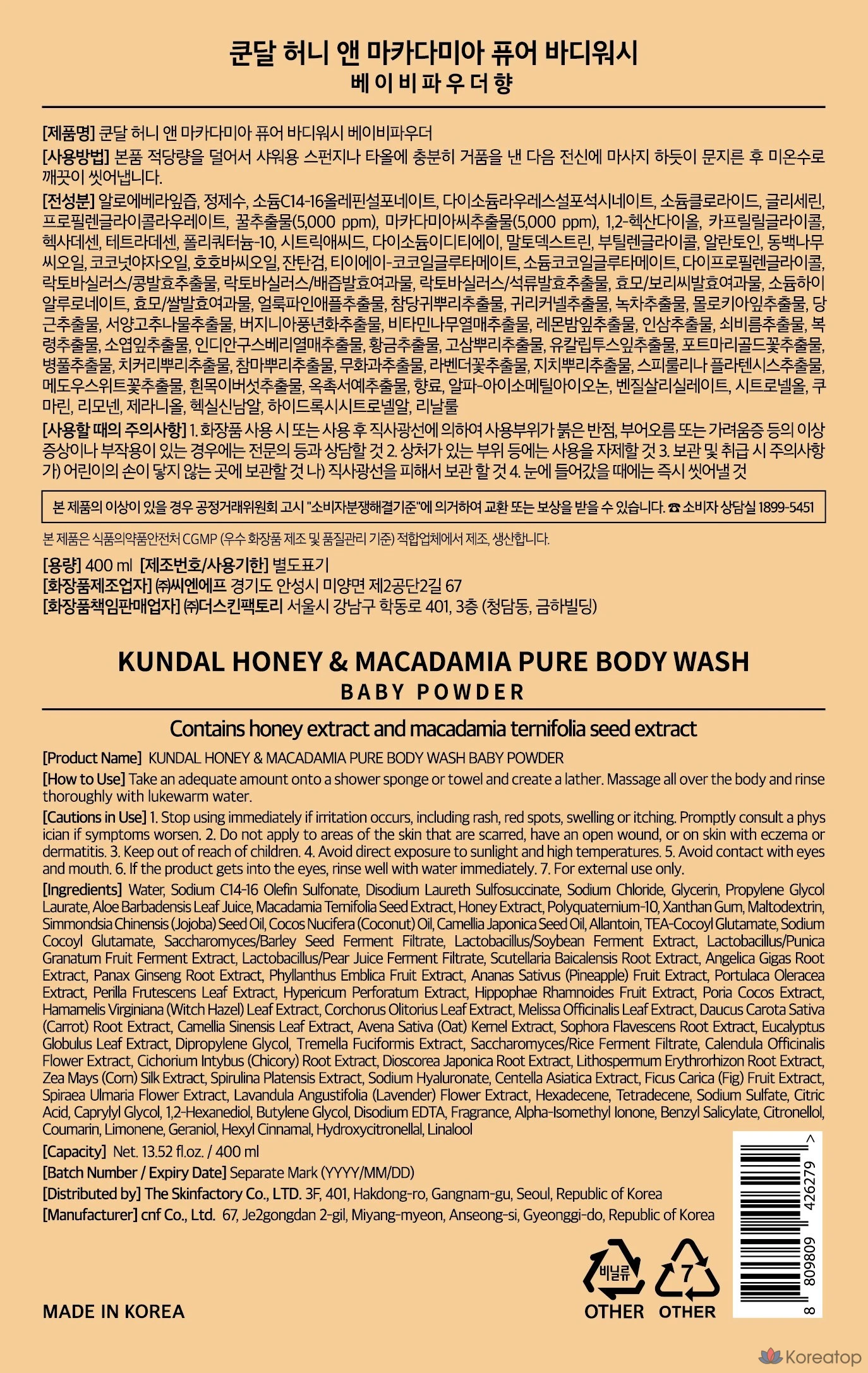 Сменный блок геля для душа Kundal Honey & Macadamia Pure Body Wash с ароматом детской присыпки, 1 шт., 400 мл.