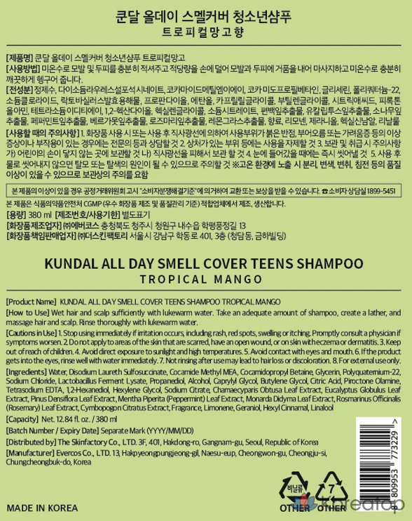 Сменный блок шампуня для кожи головы Kundal All Day Smell Cover Youth Scalp с ароматом тропического манго, 1 шт., 380 мл.