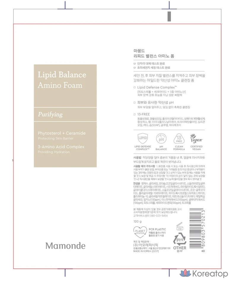 Очищающая пенка для лица Mamonde Lipid Balance Amino, 120 г, 1 шт.
