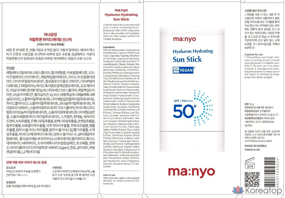 Manyo Factory Гиалуроновый увлажняющий солнцезащитный стик SPF50+ PA++++, 1 шт., 18 г
