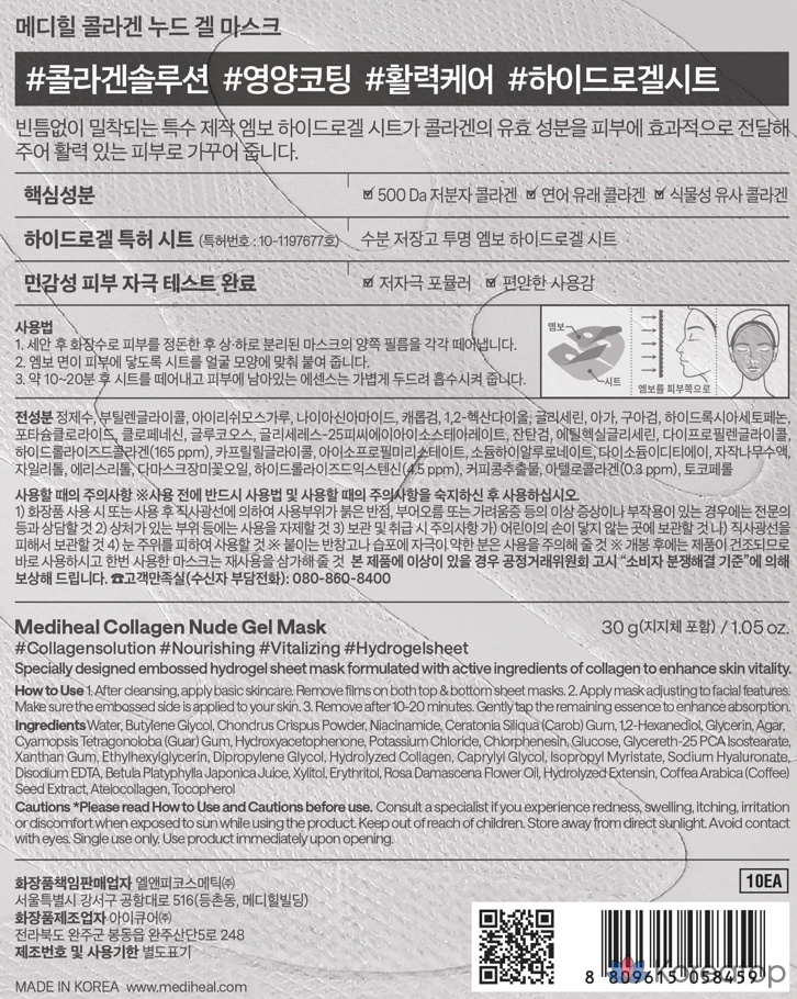 Гелевая маска Mediheal Collagen Nude, 10 штук, 1 упаковка