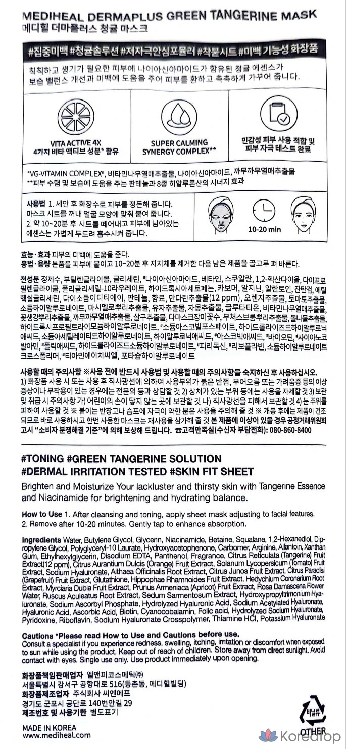 Маска для лица Mediheal Derma Plus Green Tangerine, 1 упаковка, 10 штук