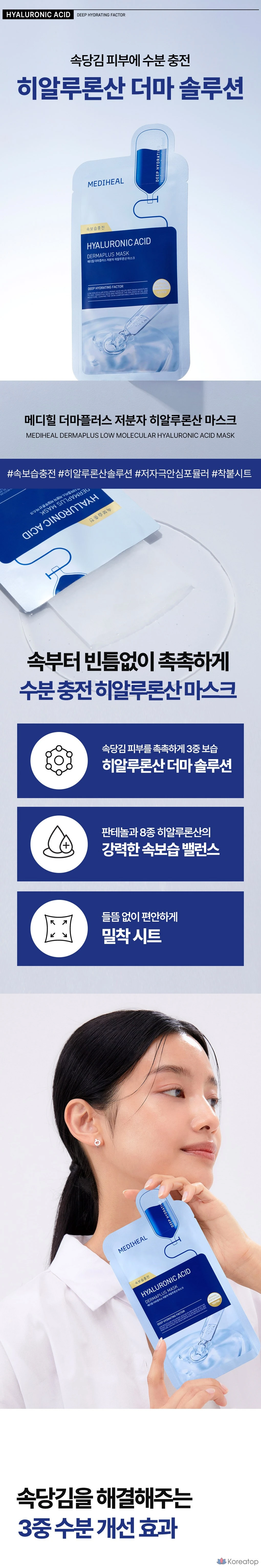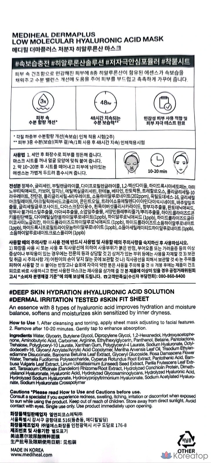 Набор масок Mediheal Derma Plus с низкомолекулярной гиалуроновой кислотой, 10 штук, 1 упаковка.