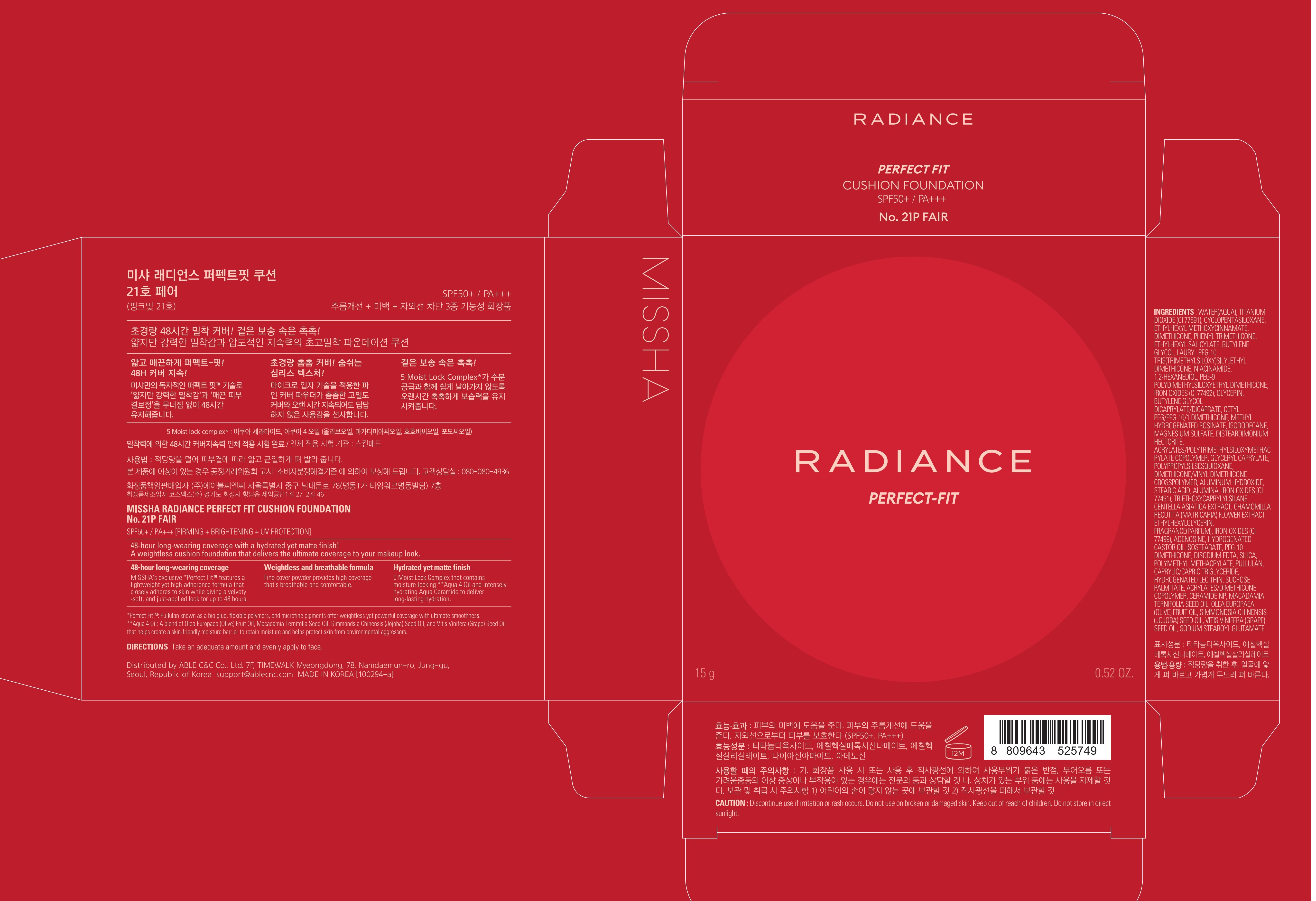 Missha Radiance Perfect Fit Cushion, 48-Hour Coverage, High Adhesion, No. 21N Vanilla, 1 шт.