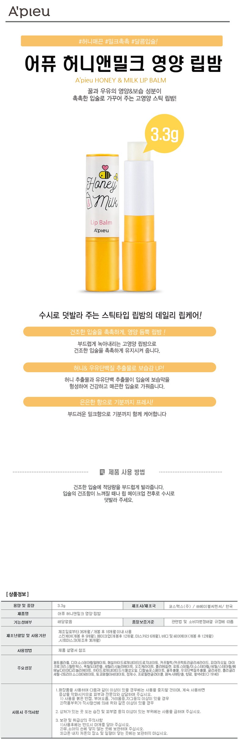 Питательный бальзам для губ Missha с медом и молоком, 3,3 г, 1 шт.