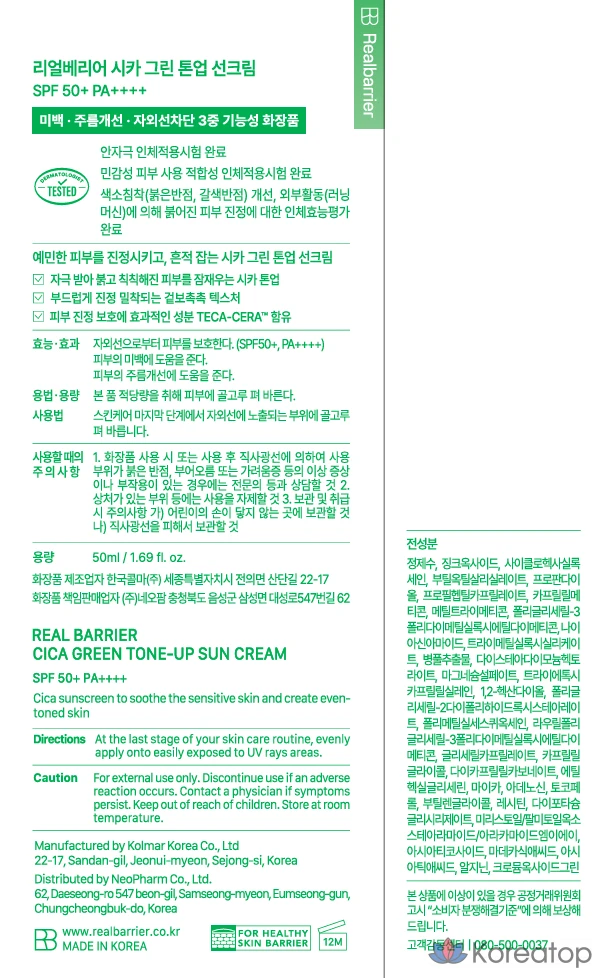Солнцезащитный крем Real Barrier Cica Green Tone-Up SPF50+ PA++++, 50 мл, 1 шт.