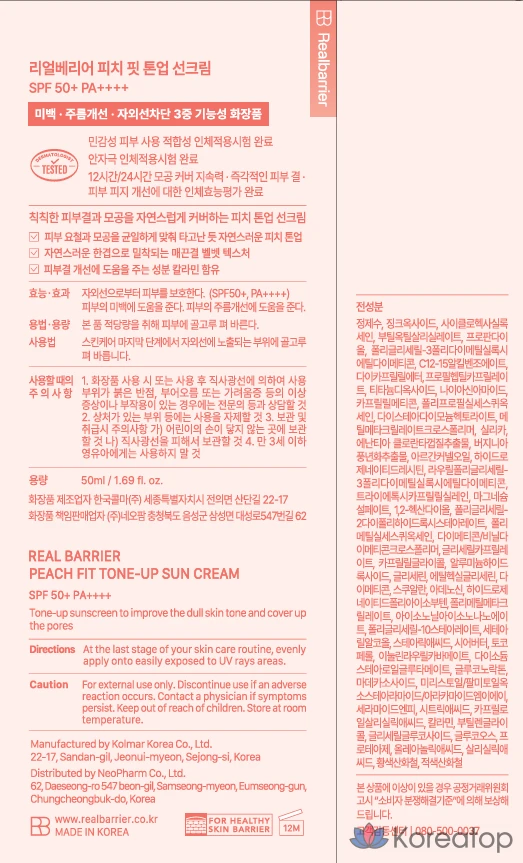 Солнцезащитный крем Real Barrier Peach Fit Tone-Up SPF50+ PA++++, 50 мл, 1 шт.