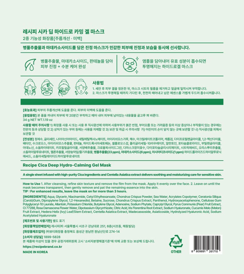 Гелевая маска для лица Re:cipe Cica Deep Hydro Calming Gel Mask, 1 комплект, 4 штуки.