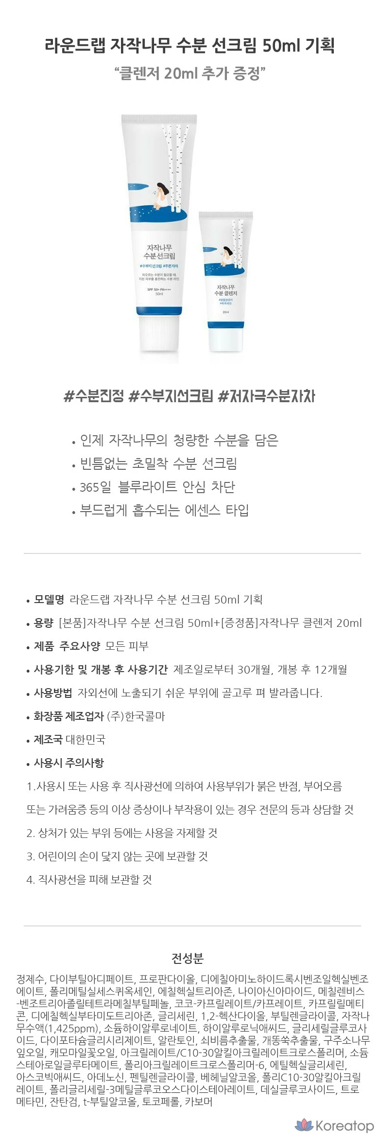 Солнцезащитный увлажняющий крем Round Lab Birch, 50 мл, очищающее средство, 20 мл, 1 шт.