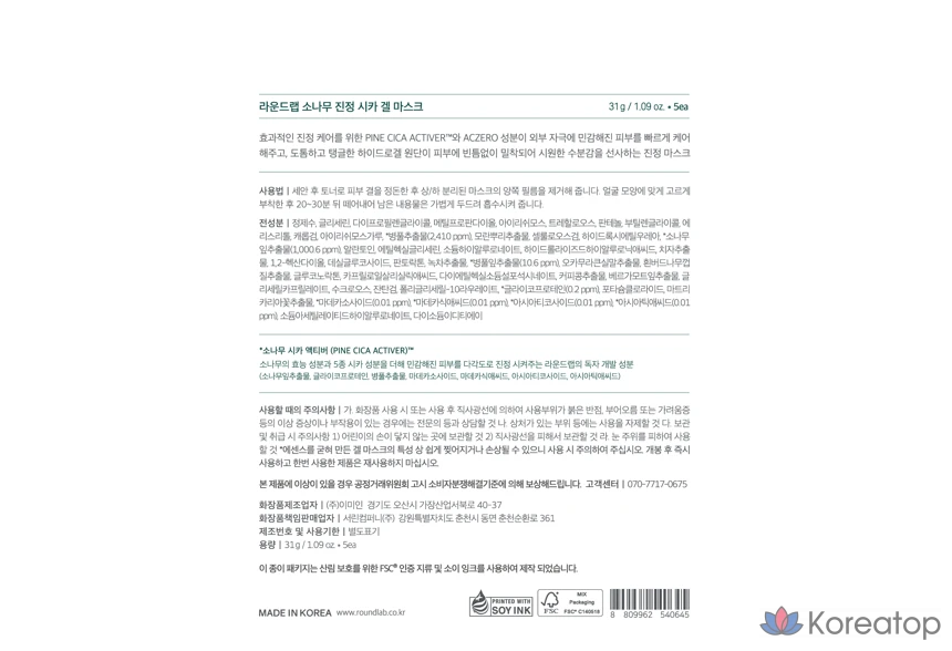 Успокаивающая гелевая маска Round Lab Pine с экстрактом центеллы азиатской, 31 г, 1 упаковка, 5 шт.