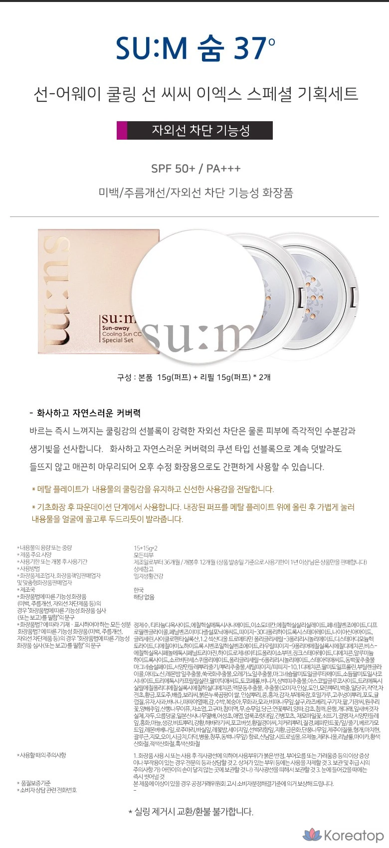 Солнцезащитный охлаждающий крем-кушон 37 Degrees Sun Away Cooling Moisture Sun Cushion CC EX, 1 основной продукт + 2 сменных блока, 1 шт.
