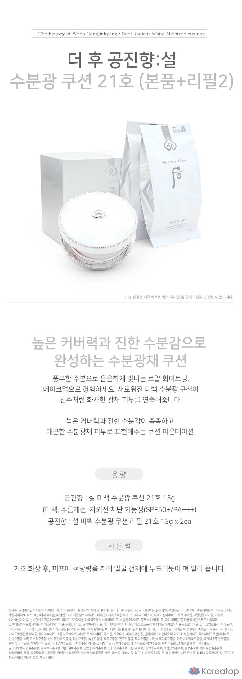 Набор увлажняющей тональной основы The Whoo Gongjinhyangseol Whitening Moisture Glow Cushion Set (основной продукт + сменный блок + сменный блок), № 21, 1 комплект