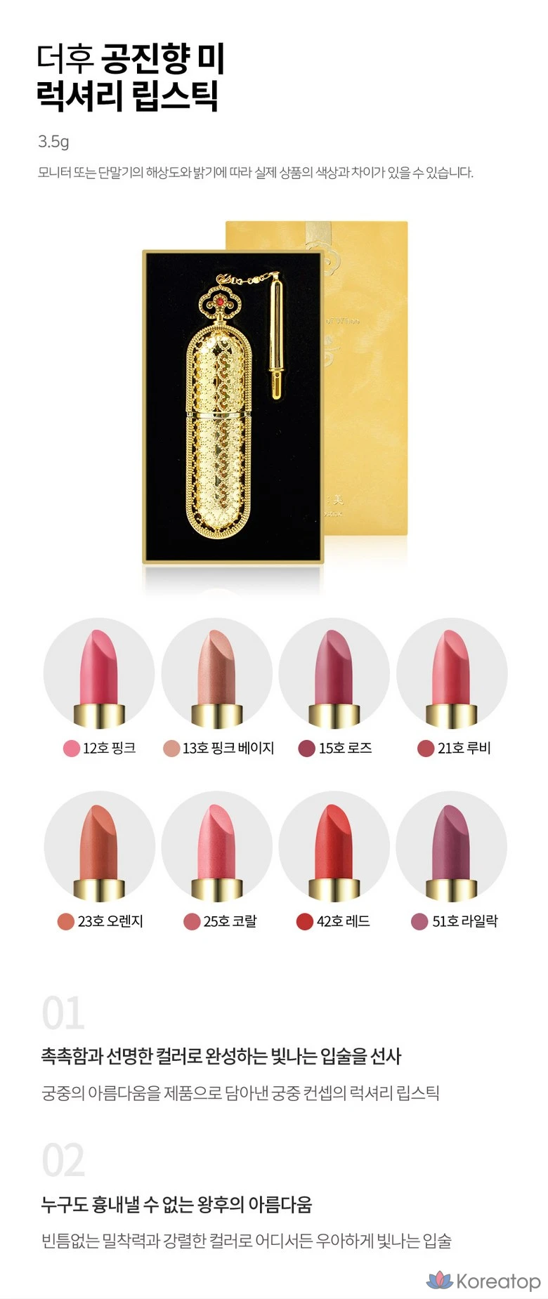 Роскошная помада с инновационной формулой, которая обеспечивает стойкий и комфортный макияж на весь день. 💄 Обогащена традиционными корейскими компонентами для ухода за кожей губ. Текстура легко наносится, создавая бархатистое, безупречное покрытие. Идеальный выбор для создания элегантного образа.