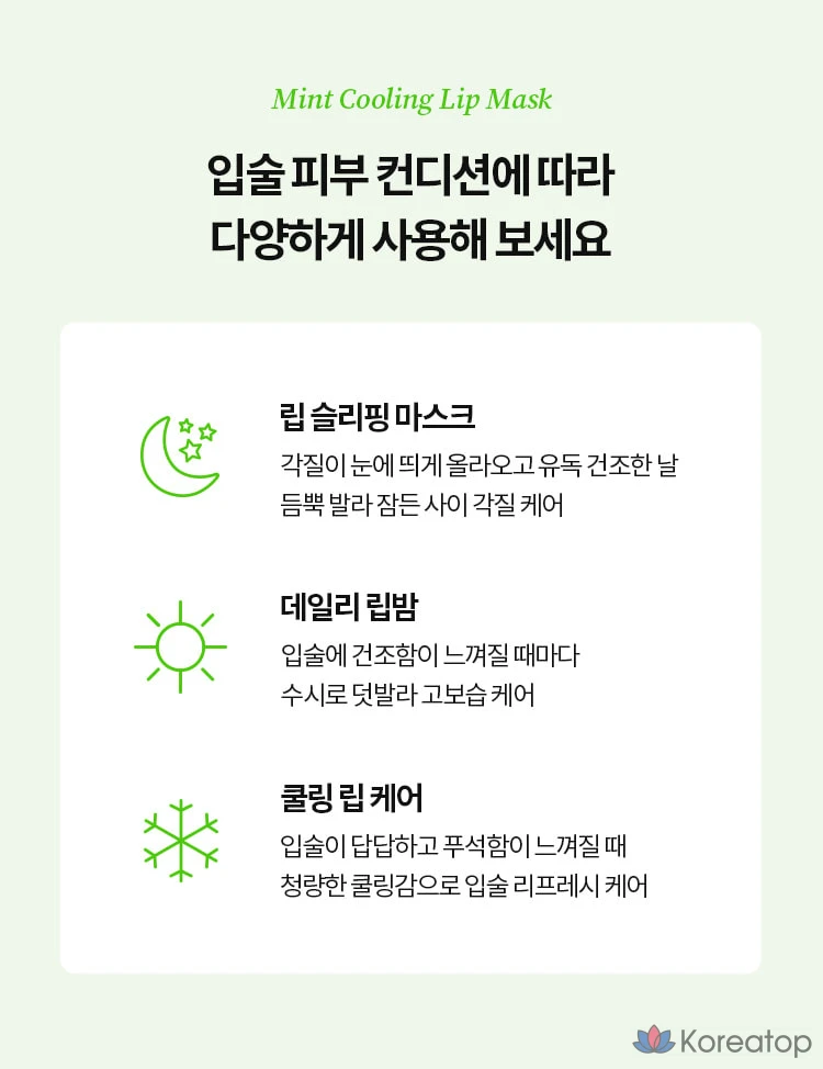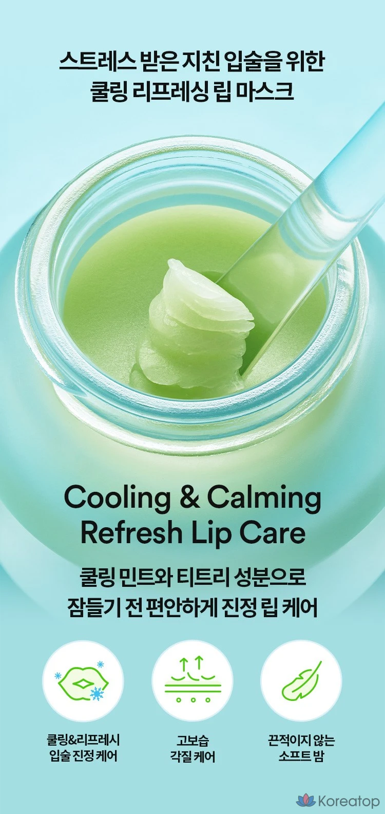 Маска обеспечивает глубокое восстановление и комфортное увлажнение. Охлаждающая текстура с мятой мгновенно освежает и успокаивает кожу. Идеальна для регулярного ухода, чтобы губы оставались мягкими и ухоженными. 🌿✨