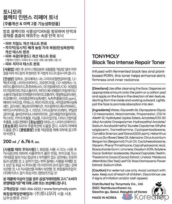 Интенсивный восстанавливающий тоник для лица Tony Moly с черным чаем, 1 шт., 200 мл